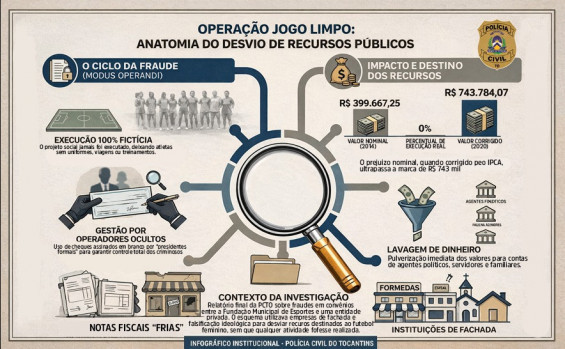 A Polícia Civil do Tocantins concluiu o segundo inquérito policial no âmbito da operação Jogo Limpo, que investiga um esquema de desvio de recursos públicos por meio de convênios firmados com a Fundação Municipal de Esportes e Lazer de Palmas (Fundesportes) no ano de 2014. Nesta etapa, oito pessoas foram indiciadas por suspeita de fraude em um convênio que deveria ter sido usado para a realização de um torneio de futebol feminino, mas foi integralmente desviado.